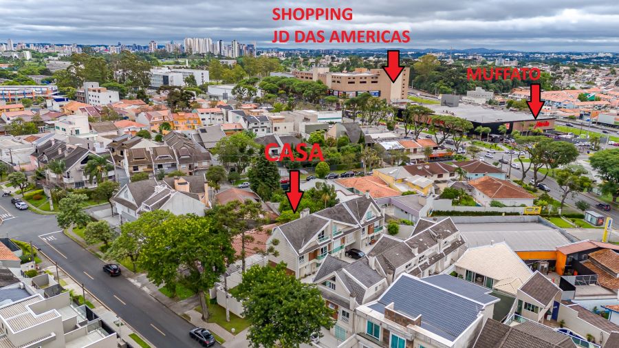 -Localizado no Jardim das Américas, um dos bairros mais valorizados de Curitiba, este sobrado fica próximo a: Shopping Jardim das Américas; Supermercados (Super Muffato); Escolas e faculdades; Comércio variado: farmácias, lojas, padarias e restaurantes; Fácil acesso ao Aeroporto Afonso Pena e vias rápidas da cidade; Excelentes praças e áreas verdes próximas